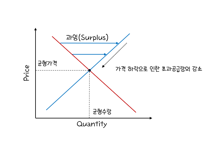 공급량이 수요량보다 많은 경우를 과잉(Surplus, 초과공급)이라 한다. 과잉 상태에서 판매자들은 가격을 내림으로써 판매량을 늘린다. 가격을 내리면 수요량이 증가하므로 시장의 과잉은 줄어든다. 평형점에 도달할 때까지 가격 하락하여 과잉이 없어진다.