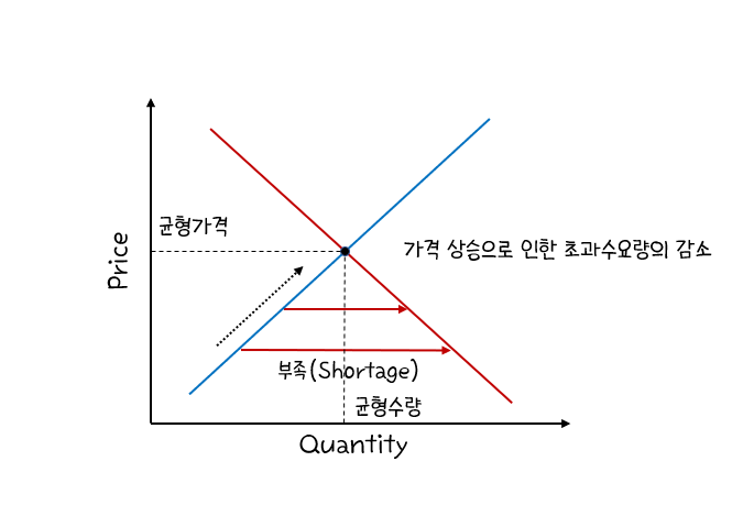 수요량이 공급량보다 많은 것을 부족(Shortage, 초과수요)라고 한다. 부족 상태에서 판매자들은 가격을 올린다. 가격을 올리면 수요량이 감소하므로 시장의 부족은 줄어든다. 평형점에 도달할 때까지 가격이 올라 부족이 없어진다.
