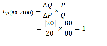 따라서 가격이 80에서 100으로 변할 때의 구간가격탄력성은 1 임을 알 수 있다. 선형 공급곡선에서 원점을 지나는 공급곡선의 점가격탄력성이 1 임도 확인할 수 있다.
