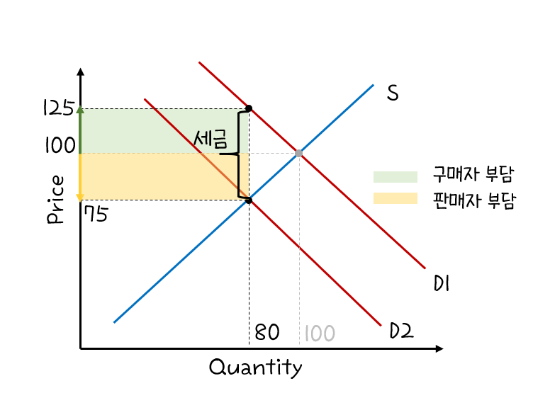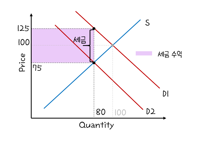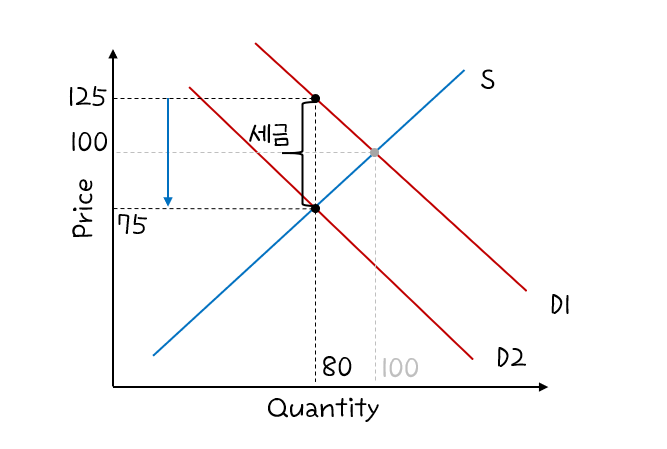 평행이동한 수요곡선은 새로운 균형점을 형성한다. 위 그래프의 경우 균형가격은 75, 균형수요량은 80으로 각각 25, 20씩 감소하였다. 이 재화를 구매하기 위해 구매자는 125(판매가격+세금)만큼 지불하고, 판매자는 75만큼을 받는다. 판매자가 받는 금액과 구매자가 지불하는 금액의 차이가 세금에 해당한다. 세금이 50만큼에 해당함을 계산할 수 있다.