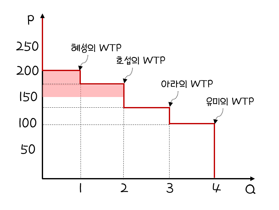 수요량-가격 그래프에 각각의 지불의사를 표시하여 나타내면 다음과 같다.