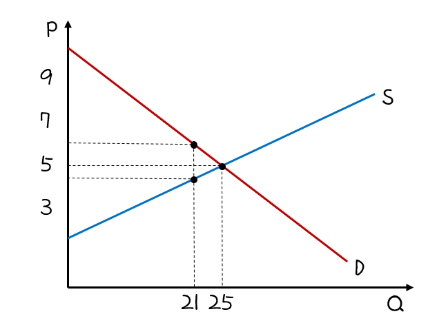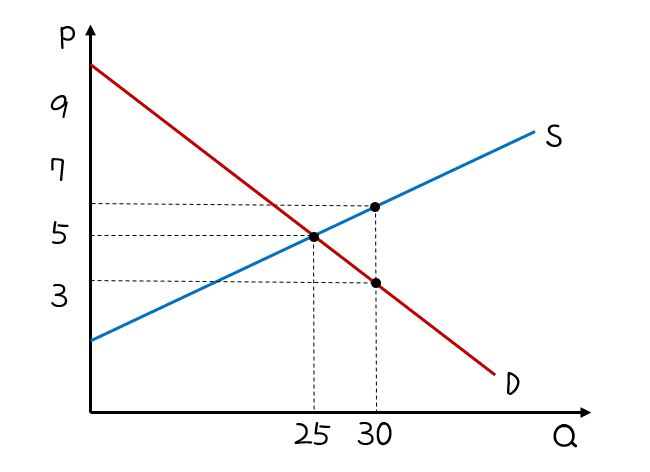 균형 수량이 25개, 균형 가격이 5만 원인 시장이 있다. 균형 상태라고 할 때, 소비자 잉여는 (10-5) X25=125만 원이고, 생산자 잉여는 (5-2) X25=75만 원이다. 총잉여는 200만 원이 된다. 소비자 잉여는 위 그래프처럼 초록색 영역에 해당하고 생산자 잉여는 노란색 영역에 해당한다.