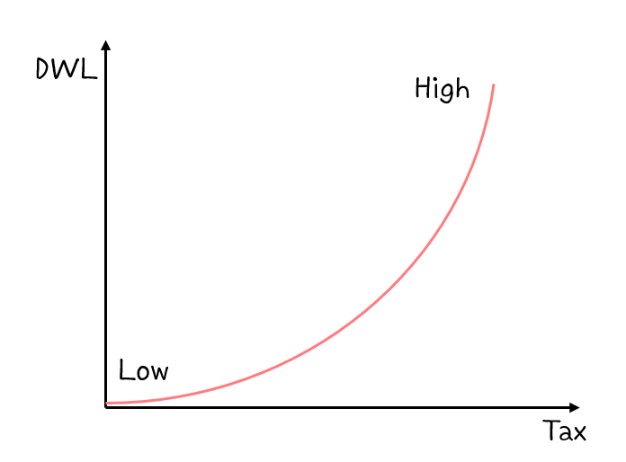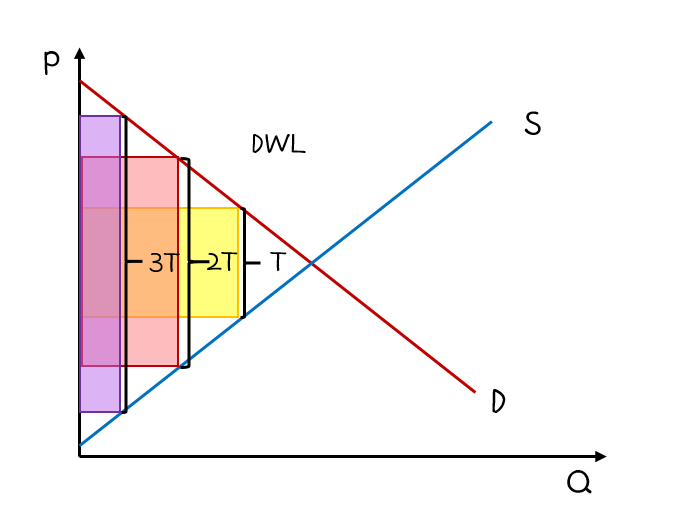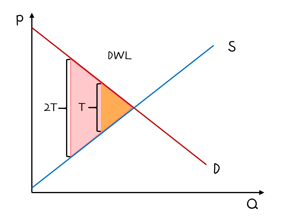 그래프를 통해 세금이 두 배 증가하였을 때, 자중손실은 두 배 이상 증가함을 알 수 있다.