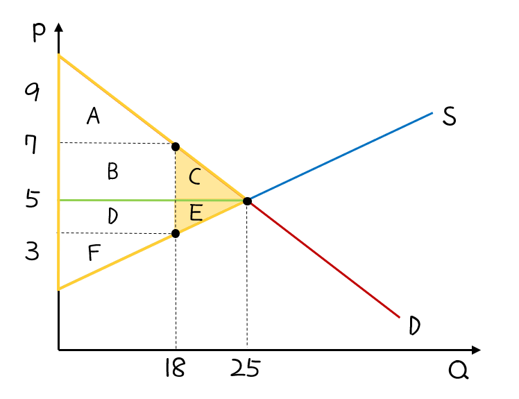 세금을 부과하지 않는 경우, 균형수량은 25개, 균형 가격은 5만 원이므로, 소비자 잉여는 초록선을 기준으로 위 삼각형(A+B+C), 생산자 잉여는 아래 삼각형(D+E+F)이다. 총잉여는 노란색 삼각형(A+B+C+D+E+F)과 같다. 세금을 부과하지 않으므로 세수는 0이다.