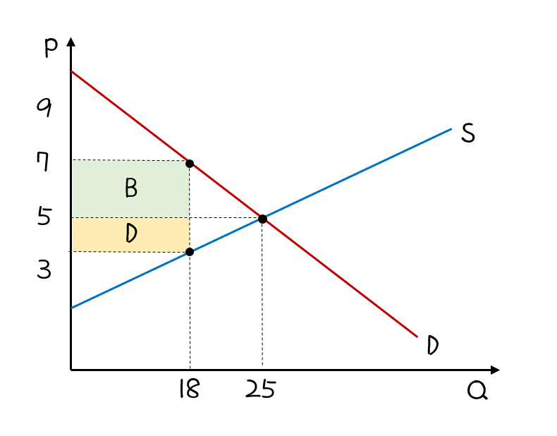 수량이 18개일 때, 판매자가 받는 가격은 4만원이고 구매자가 지불하는 가격은 7만 원이다. 세금의 규모는 개당 3만 원이고, 세금 수익(Tax Revenue)은 3X18=54만 원이다. 그래프 상에서는 초록색 영역과 노란색 영역을 합친(B+D) 영역이 세수를 나타낸다.