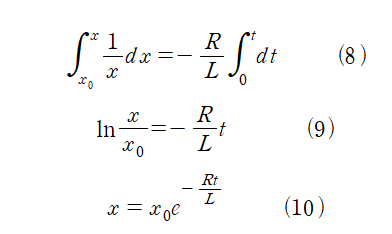 ε 는 전지의 기전력(전체 회로에 걸리는 전압)이다. 양변을 R로 나누고 x= ε /R - I로 치환하면,